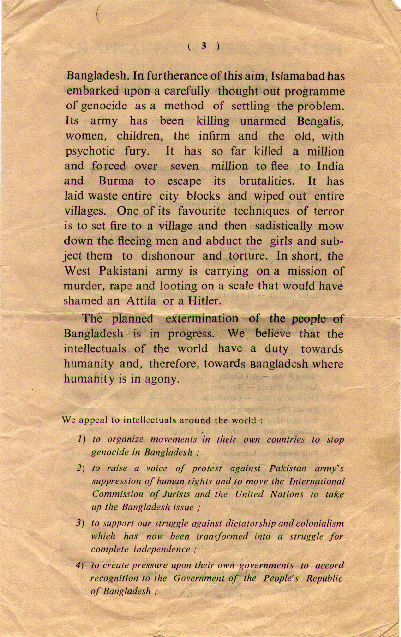 The Bangladesh Liberation Council of the Intelligentsia was an organization of displaced teachers, scientists, poets, artists, writers, journalists and actors of Bangladesh who managed to escape the wrath of the Pakistani army during the war . The council was formed with the objective of supporting the war efforts of the Bangladesh Government, to press to the attention of the world our case for independence, to document crimes of the Pakistan Army, to do educational work among our freedom fighters, and to find for their members means of subsistence while they work for the liberation movement. These documents are courtesy of Dr. Bilayet Hussain, then reader of Physics at Dhaka University, and the Joint Secretary of the Council. These priceless documents give as a breathtaking inside into the working of these great patriots.