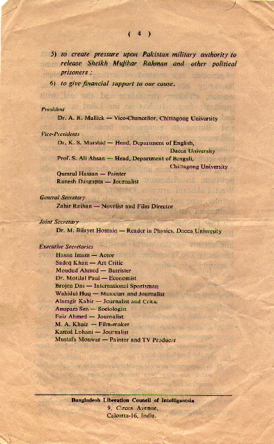 The Bangladesh Liberation Council of the Intelligentsia was an organization of displaced teachers, scientists, poets, artists, writers, journalists and actors of Bangladesh who managed to escape the wrath of the Pakistani army during the war . The council was formed with the objective of supporting the war efforts of the Bangladesh Government, to press to the attention of the world our case for independence, to document crimes of the Pakistan Army, to do educational work among our freedom fighters, and to find for their members means of subsistence while they work for the liberation movement. These documents are courtesy of Dr. Bilayet Hussain, then reader of Physics at Dhaka University, and the Joint Secretary of the Council. These priceless documents give as a breathtaking inside into the working of these great patriots.
