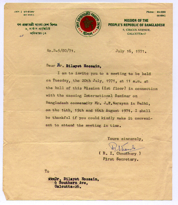 A letter to Dr. Hossain from the Secretary of the Bangladesh Mission in Calcutta