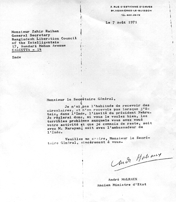Andre Malraux was a true friend of Bangladesh. A resistance member during the 2nd World War, and the author of Le Humane Condition (1933), he was ready to parachute into Bangladesh to liberate her.